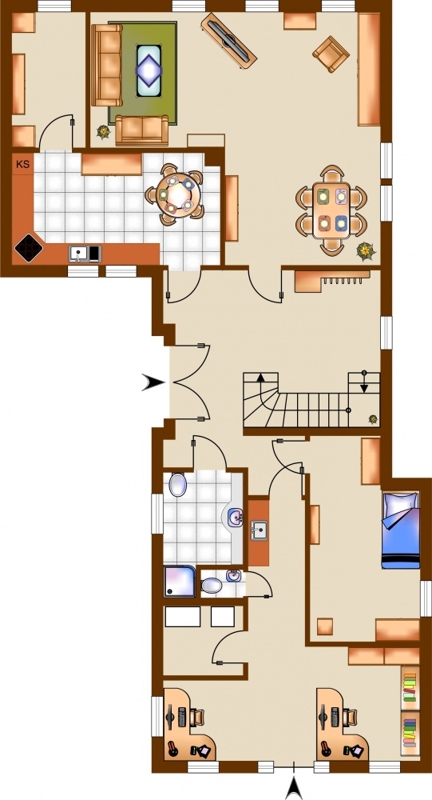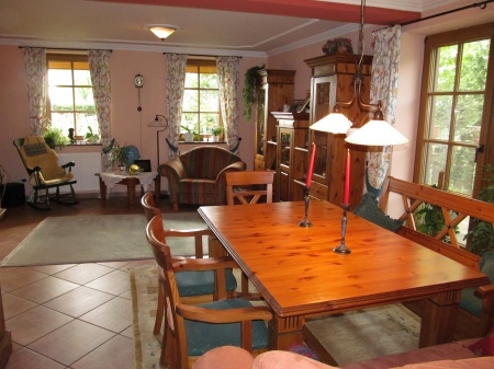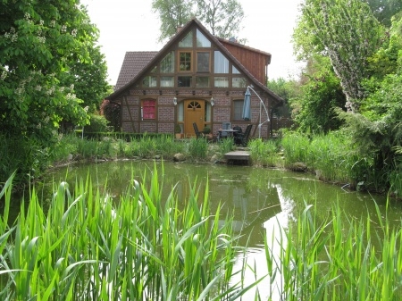 Durch die 2009 abgeschlossene komplette Sanierung ist hier ein idyllisches Einfamilienhaus mit traumhafter Außenanlage entstanden. Rund um das Haus bieten verschiedene Terrassen die Möglichkeit zu entspannen oder mit Freunden und Bekannten den Sommer zu genießen. Im Erdgeschoss befindet sich das sehr geräumige Wohn- und Esszimmer mit Kamin und Zugang zur Süd-West Terrasse, sowie eine vollausgestattete Küche mit Granitarbeitsfläche und Hauswirtschaftsraum. Neben einem Duschbad und einem Schlafzimmer ist Über den Flur ein weiterer Wohnraum mit WC und Küchenzeile zu erreichen. Das Obergeschoss kann als eigenständige Wohnung genutzt werden, da hier eine weitere Küche und ein sehr geräumiges Badezimmer vorhanden sind. Die Front des Giebelzimmers ist komplett verglast und bietet einen schönen Ausblick auf die Teichanlage. Ein weiteres Zimmer und ein Schlafzimmer mit begehbarem Kleiderschrank schaffen viel Platz für individuelle Gestaltung. Die repräsentative Einfahrt und ein Büro im Nebenhaus ermöglichen es z.B. ein kleineres Unternehmen von hier aus zu betreiben. Für Pferdefreunde bietet der Schleppdachunterstand zwei Pferdeboxen und Lagerraum für Futter und Zaumzeug.Lagebeschreibung: