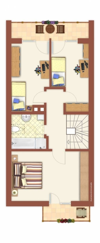 Zum Verkauf steht hier ein Reihenmittelhaus in 1 1/2 geschossiger Bauweise. Erbaut wurde dieses 1984 mit einer Teilunterkellerung. Durch die Nord-Süd Ausrichtung und die großen Fensterflächen zum Garten gelangt viel Licht ins Gebäude. Im Erdgeschoss bietet die Immobilie eine geräumige und moderne Küche sowie einen separaten Essbereich. Außerdem ein Gäste WC. Das Wohnzimmer liegt mit Split-Level etwas tiefer und damit ebenerdig zum Garten. Das Erdgeschoss ist komplett gefliest. Im Obergeschoss befinden sich 3 Schlafräume und ein gepflegtes Bad mit Badewanne. Alle Schlafzimmer haben Zugang zu einem Balkon oder einer Loggia über die gesamte Gebäudebreite.Lagebeschreibung: