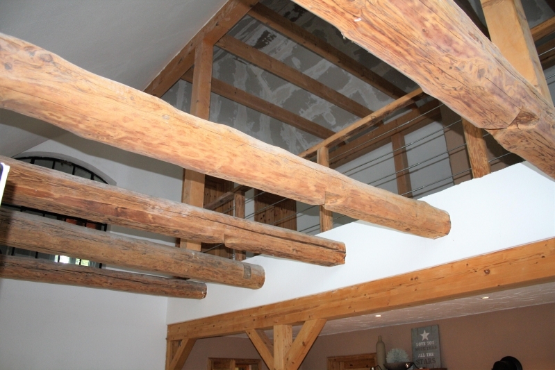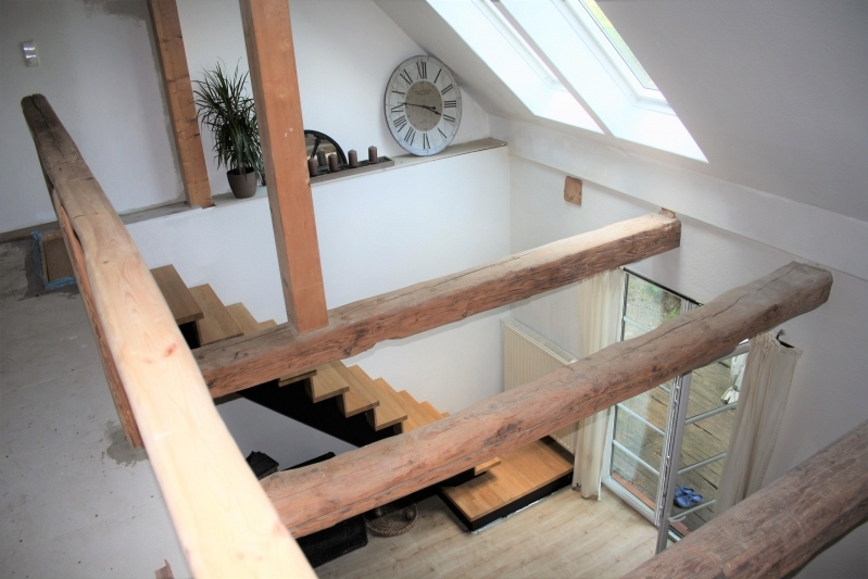 Den Wohnmittelpunkt stellt eindeutig das Wohnzimmer dar, welches durch die großzügige Raumhöhe seinen eigenen Charme erhält. Unterbrochen durch ursprüngliche, neu aufgearbeitete Holzbalken haben Sie freien Blick auf die Galerie im ca. 58m² großen, ausgebauten Dachgeschoss. Hier lässt sich mit einigem handwerklichen Geschick gemütlicher Wohnraum herrichten.