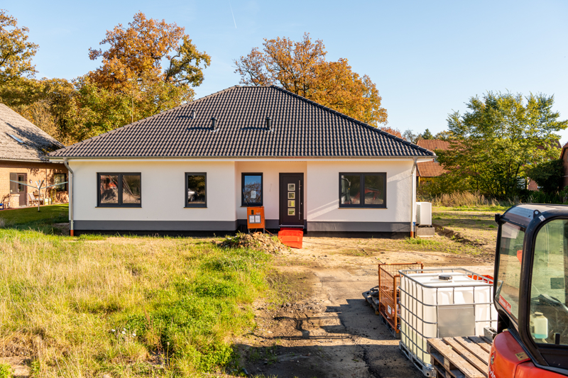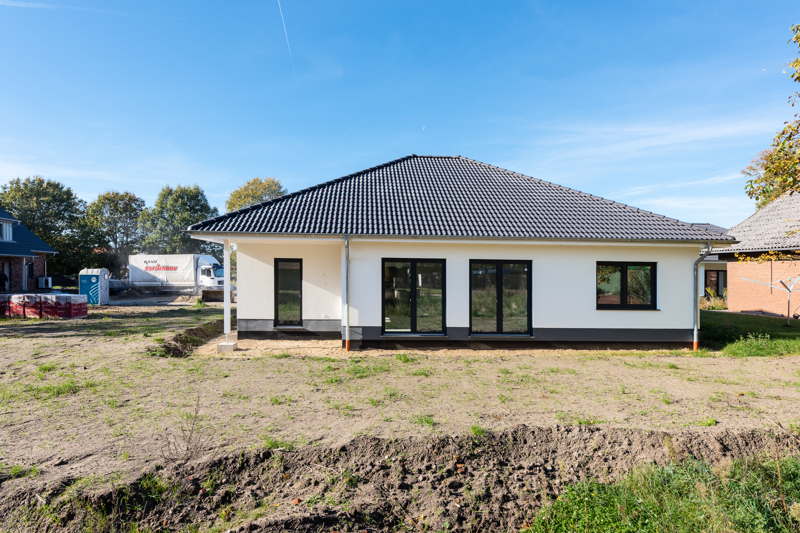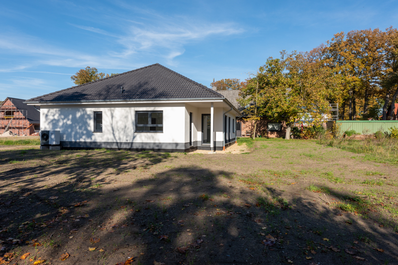 Bei der hier angebotenen Immobilie handelt es sich um einen Energieeffizienz-Bungalow aus dem Jahre 2021. Die besondere Bauqualität hat sich über die letzten Jahre immer weiterentwickelt und den Umständen angepasst. Das Ergebnis ist z.B. dieser Bungalow mit gut durchdachtem Grundriss und einem Endenergiebedarf von nur 19,2 kwh/m² a. Auf ca. 140 m² Wohnfläche bietet diese Immobilie alles, was ein modernes Haus benötigt. Ein geräumiges Wohnzimmer mit offener Küche und großer Fensterfront, ein Gästezimmer und ein Gäste-Bad mit Dusche, ein Schlafzimmer mit Ankleideraum, außerdem ein Vollbad mit Fenster, sowie ein weiteres Zimmer und einen Abstell-, sowie einen Hauswirtschaftsraum. Für weiteren Platzbedarf ist in dieser Immobilie der Ausbau des Dachgeschosses bereits vorbereitet. Mit wenig Aufwand kann hier weiterer Wohnraum geschaffen werden.Das Haus ist auf der nördlichen Seite des Grundstückes gebaut, sodass der Garten den ganzen Tag in der Sonne liegt.