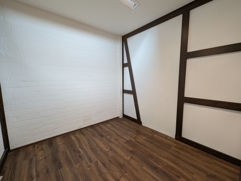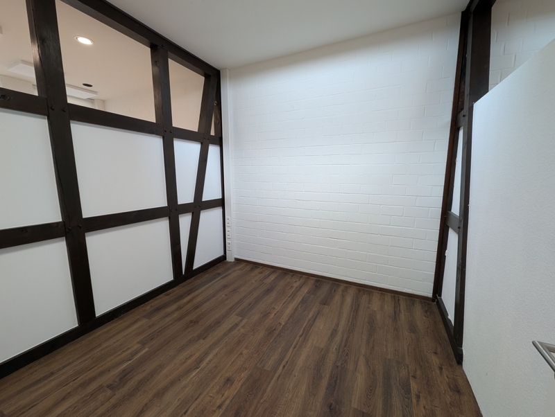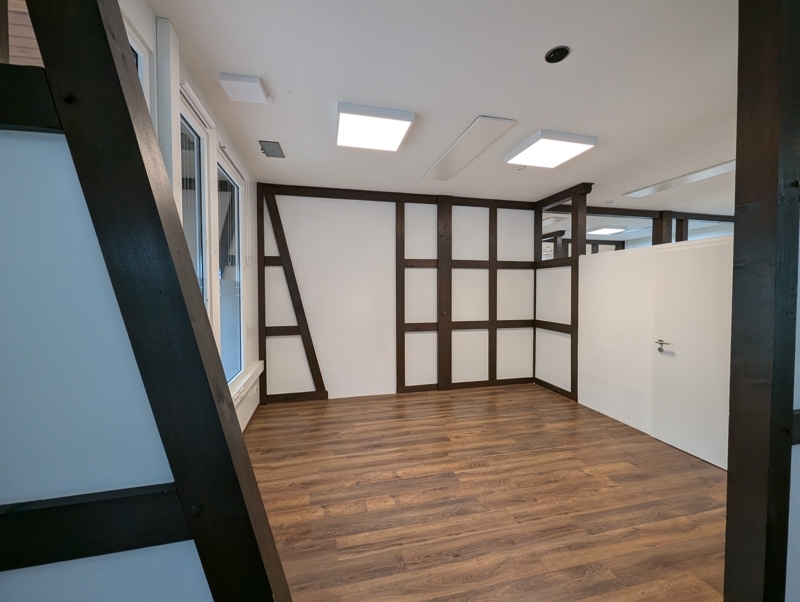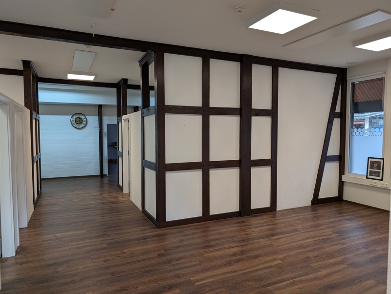 Momentan ist die Gewerbefläche im Inneren durch Leichtbauwände und aufgefülltes Fachwerk in mehrere Büros unterteilt. Dies kann bei Bedarf jedoch rückgängig gemacht werden.