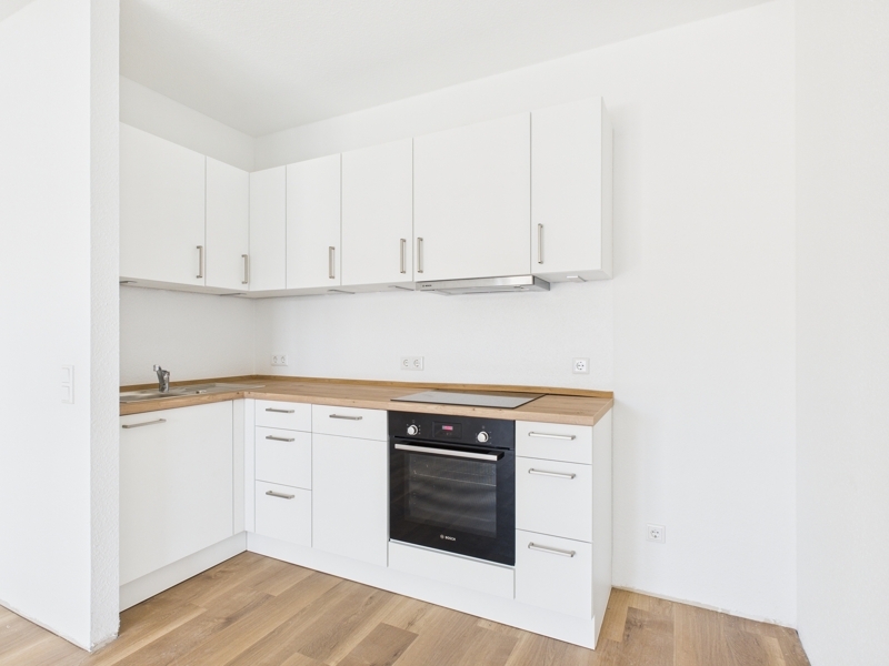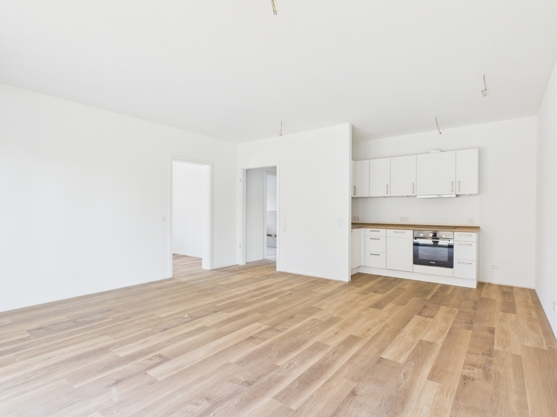 Auf rund 65 m² Wohnfläche verteilen sich drei Zimmer: ein offener Wohn- und Kochbereich mit neuer Einbauküche, ein Schlafzimmer sowie ein weiteres Zimmer, das sich ideal als Büro, Ankleidezimmer oder Gästezimmer eignet. Bodentiefe Fenster sorgen für lichtdurchflutete Räume und schaffen eine freundliche, großzügige Atmosphäre.