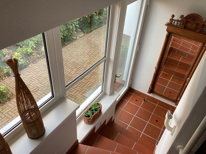 Schon beim Betreten des Grundstücks empfängt Sie eine kleine grüne Oase mit gemütlicher Terrasse zur Alleinbenutzung – der perfekte Ort zum Entspannen und Abschalten. Über die moderne Biffar-Sicherheitstür mit Tastencode gelangen Sie in den hellen Eingangsbereich mit zeitlosen Terrakottafliesen, der den hochwertigen Charakter der Wohnung sofort erkennen lässt.